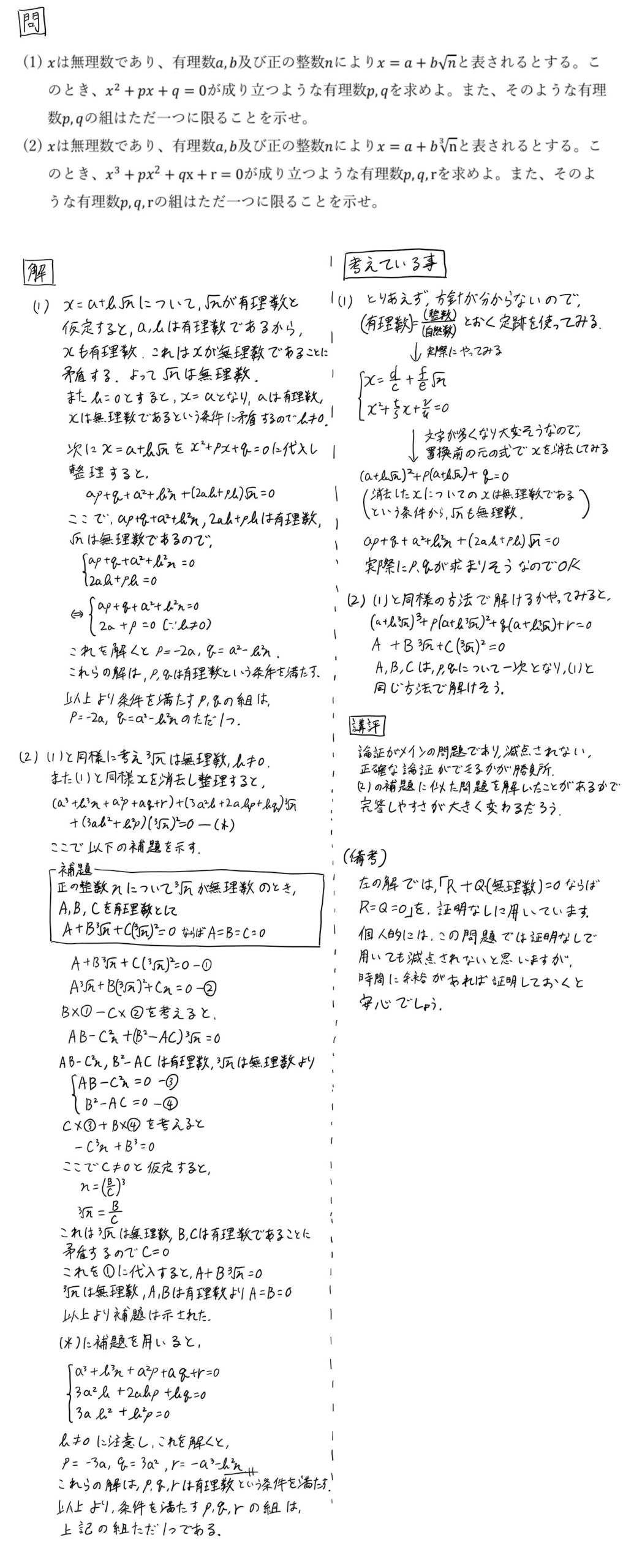第一問は、有理数、無理数関係の、論証問題でした。